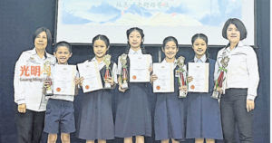 黄淑贞(右)颁奖给诗歌朗诵低年组得奖的学生后合照留念。左为黄基金。 诗歌朗诵高年组得奖的学生在领取奖盃后与嘉宾合照留念。左与右分别为黄基金与黄淑贞。 倪炳水(右)颁奖给书法比赛高年组的得奖学生。 孙汶明(右)颁奖给书法比赛低年组的得奖学生。