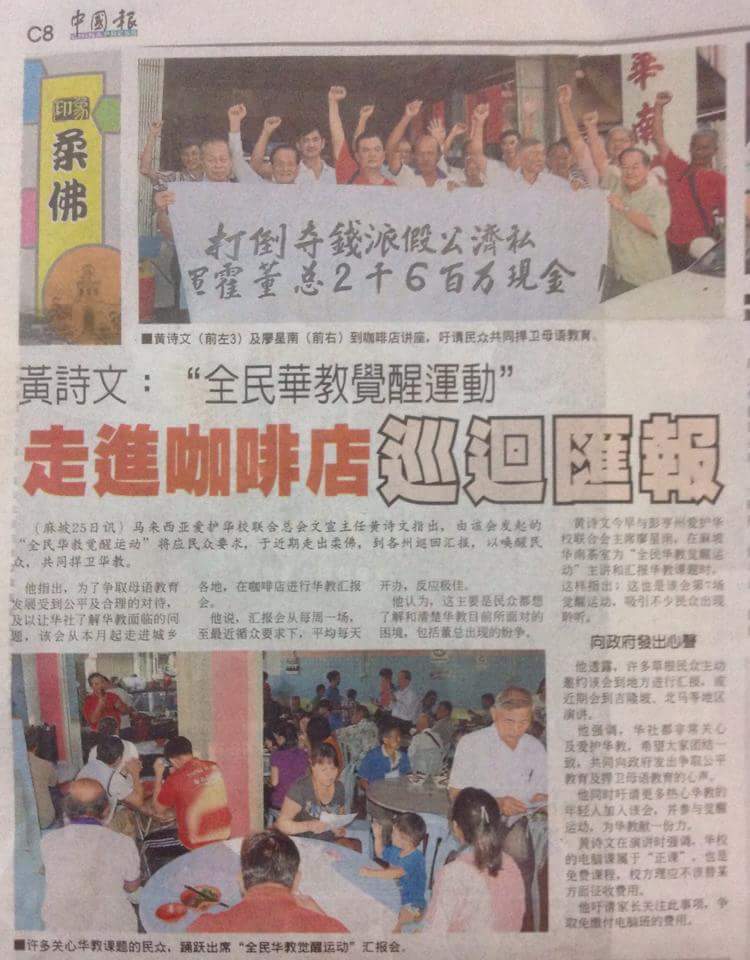 日前,柔佛州一批热心华教人士,抱着“维护华教、人人有责”这一朴素理念,到处奔波,在不足两个星期的时间,一共举办过六场“咖啡店汇报会“,上千人出席交流会,一早抵达第七站——在蔴坡三马路华南茶室。